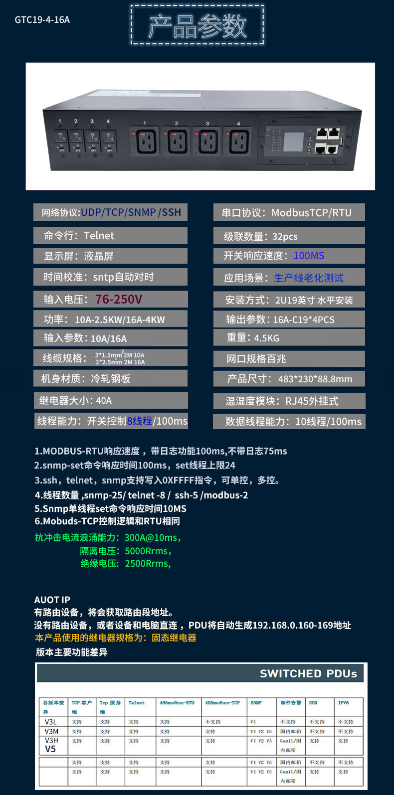 AI服务器老化测试 抗电流冲击智能PDU GTC19-4-16A